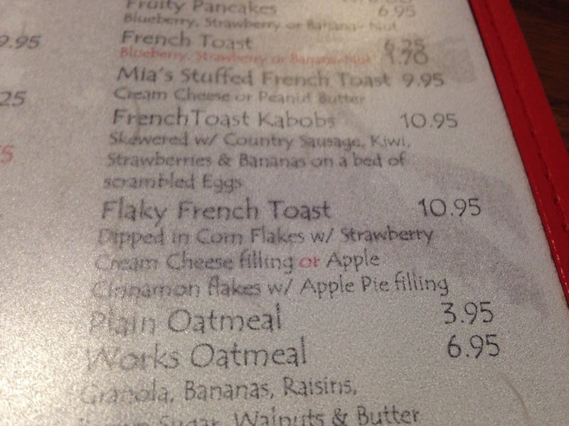 Breakfast menu was quite large with some interesting combinations. The food itself was average, and the service was below average. -Colin