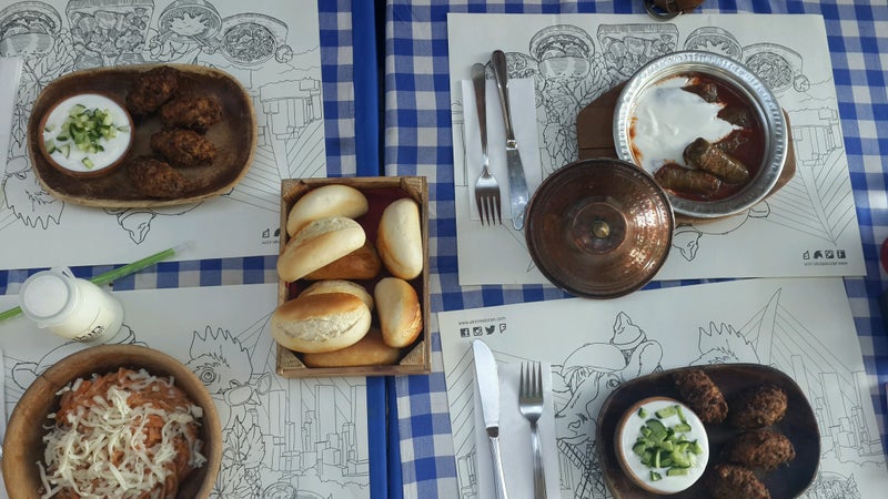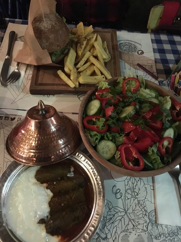 Menünün bir kısmı; Baba salatası, anne köftesi, görümce dolması, köy hamburgeri...Asma yapraklarının altında, Ege köyü kahvesi... -burcu