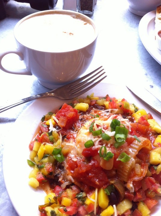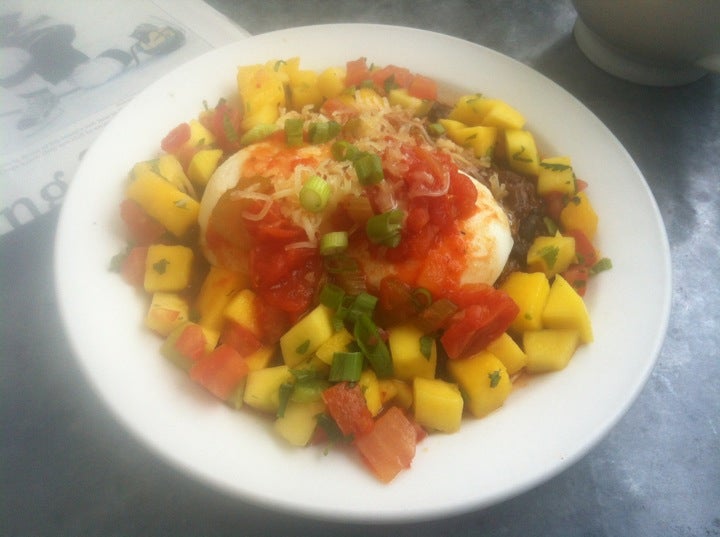 The huevos rancheros were divine. The corn or flour tortilla is buried under a mountain of mango salsa and black beans with a poached egg or 2 in the middle. -Helen