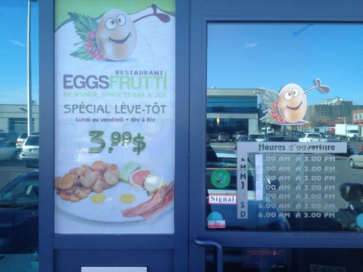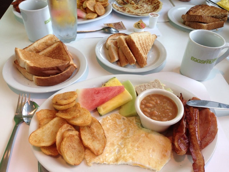 The Eggs Frutti plate has everything: eggs, crouton, beans, potatoes, bread, bacon, ham, sausage, pancakes, fruit... and cholesterol is free! -Othon