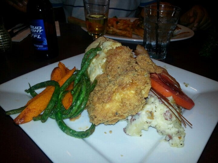 Chicken & biscuits. Huge plate. Chicken seared served on mashed potatoes & biscuits, topped with gravy. Oh yeah veggies too. Wonderful!! You have to hungry to eat here. It's the best! -Jen