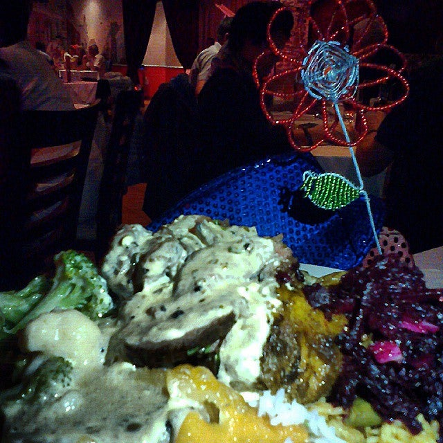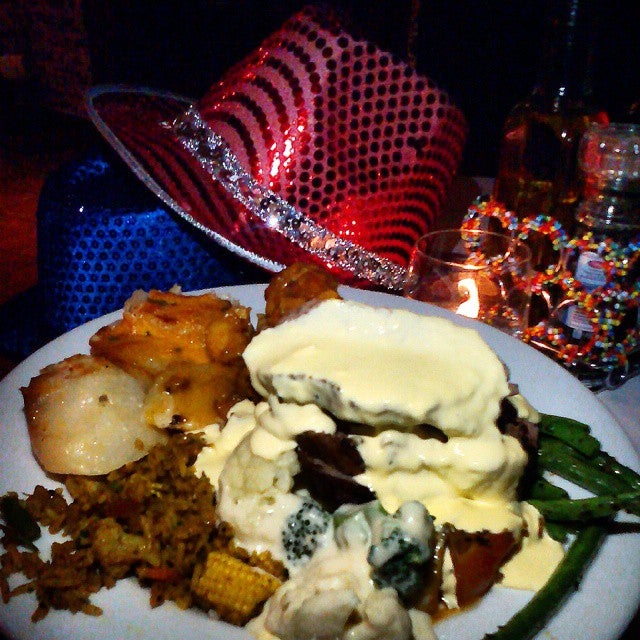 Buffet roast, kingclip/linefish in creamy sauce, creamed broccoli&cauli, roast butternut & sweet potato, potato bake, briyan , samosa, snook pate, salad, malva, melktart, fruit & koeksister -Yajna
